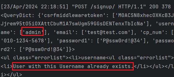 분명, 비밀번호와 관련된 validation은 form에서도, Custom model에서도 정의해주지 않았지만, 입력값에 따라 문제가 있다면 오류를 출력하고 있는 것이 확인되는데, 이것은 UserCreationForm에서 패스워드와 관련된 내역을 처리해주기 때문이다. 물론, 비밀번호 뿐만 아니라 계정명 역시 UserCreationForm과 관련이 있기 때문에 이미 존재하는 계정명을 입력하는 경우, Unique 에러가 발생한다.